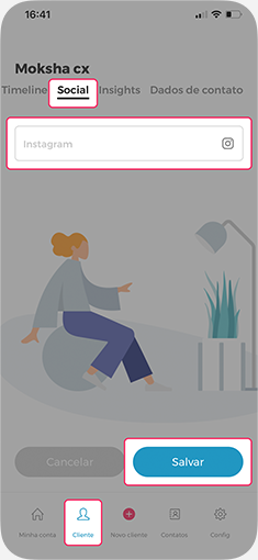 Na tela Social do seu cliente, informe o nome de usuário Instagram dele no campo Instagram e clique em Salvar.