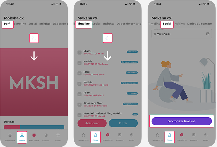 Quando você já informou o Instagram do cliente, atualize os itens de timeline das seguintes formas: