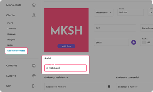 Nos dados de contato do seu cliente, informe o nome de usuário Instagram dele no campo Social.