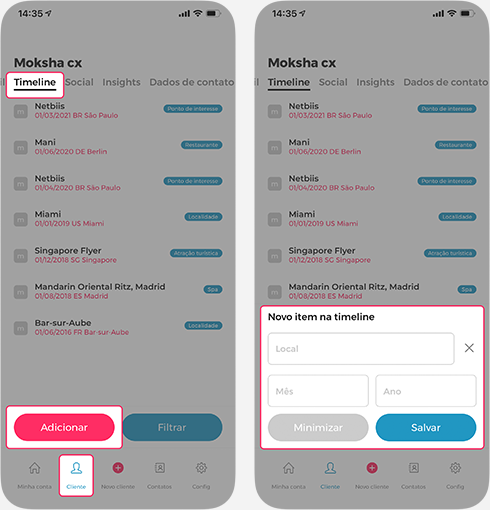 Na aba Timeline do seu cliente, clique no botão Adicionar item e preencha os campos que aparecerão em Novo item de timeline.