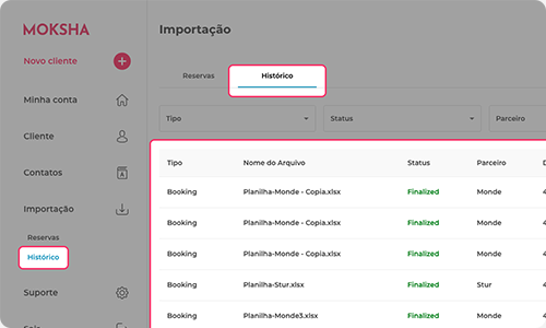 Pronto! As reservas do seu cliente serão carregadas para o Moksha, criando ou atualizando o perfil e relacionando seus dados de reserva.