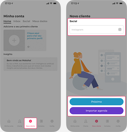 Você você pode iniciar o cadastro informando o usuário Instagram dele. Se for um contato privado o Moksha enviará um pedido para você seguí-lo.