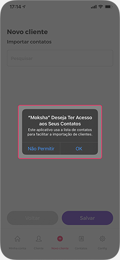 Você deverá dar permissão para o Moksha acessar seus contatos.
